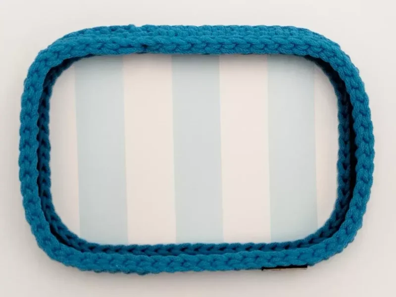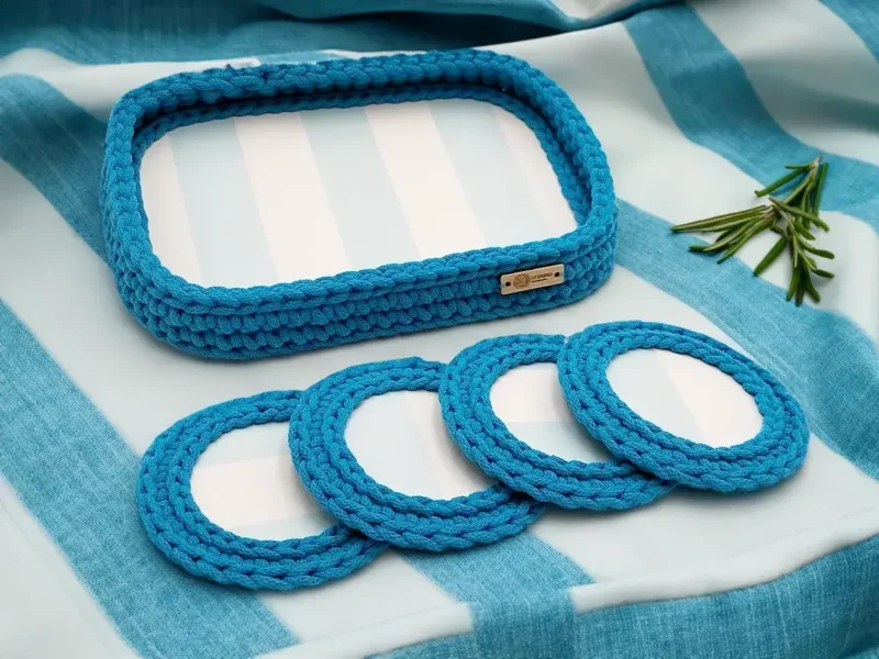 Zapoznaj się z naszą ofertą tacki i podkładek pod kubki wykonanych ręcznie ze sklejki i niebieskiego sznurka. Tacka i podkładki są nie tylko funkcjonalne, ale także dekoracyjne, dzięki wzorowi w biało-błękitne pasy, który nawiązuje do stylu marynistycznego. Tacka i podkładki dodadzą uroku i elegancji każdemu wnętrzu, sprawiając, że będzie ono wyglądać bardziej estetycznie i przytulnie.  Zestaw składa się z jednej tacki i czterech podkładek. Tacka i podkładki są łatwe w utrzymaniu w czystości, wystarczy przetrzeć je wilgotną szmatką.