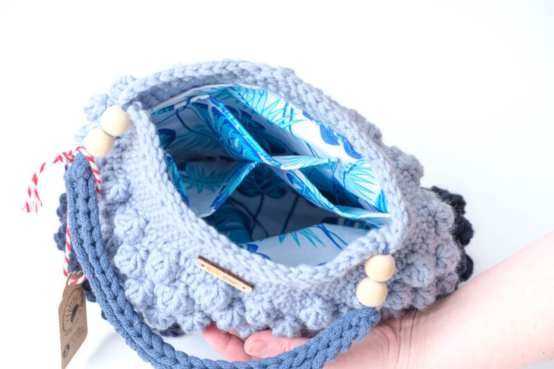- Wewnątrz torebki znajduje się podszewka w kolorze białym w błękitne i niebieskie wzory.